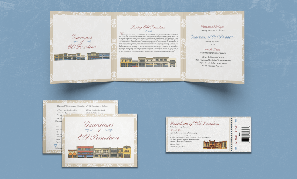 This was an in depth job for the Pasadena Heritage. They needed invites, tickets, envelopes, return tickets and more, done for the annual Guardians of Old Pasadena event.