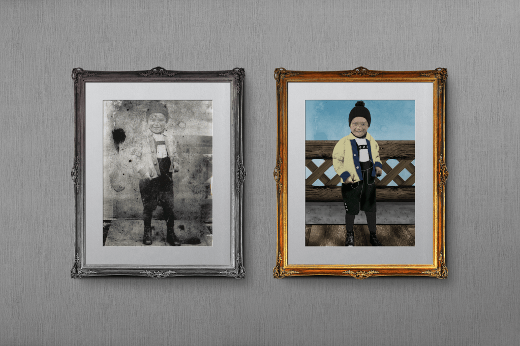 My mom has had this photo from my grandpa coming to America from Germany when he was 6 years old. She took the original tin to a place to get it restored, and they “lost” the tin. So, I took the copy and restored it for her and my grandma.